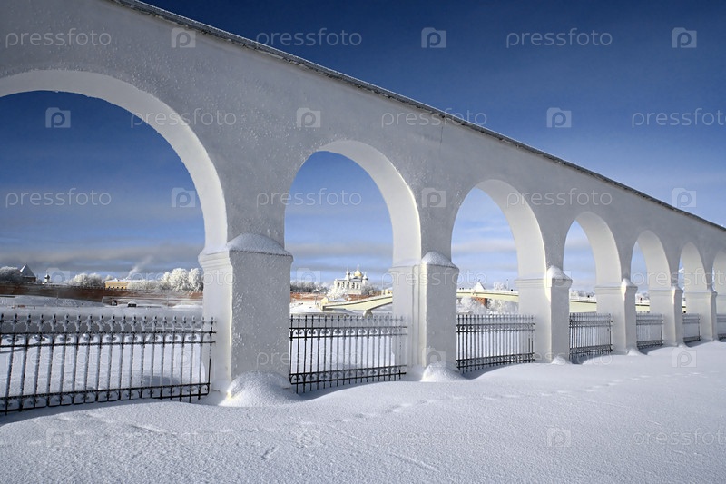 Древняя белая стена из арок в заснеженном поле