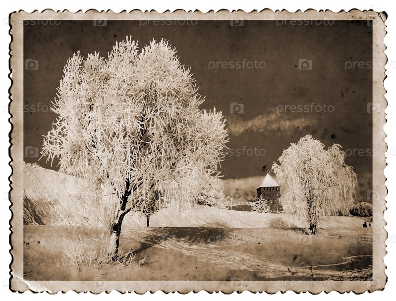 Заснеженные деревья и виднеющийся вдалеке кремль, изображенные на фотобумаге с эффектом старения