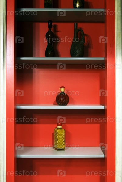 Стеклянные флаконы и керамический кувшин, стоящие на полках