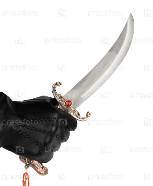 Черная кожаная перчатка с кинжалом, изолированная на белой