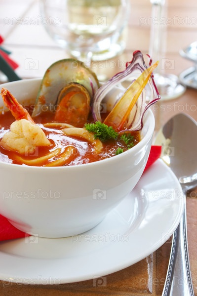 Тарелка с томатным супом на столе в ресторане