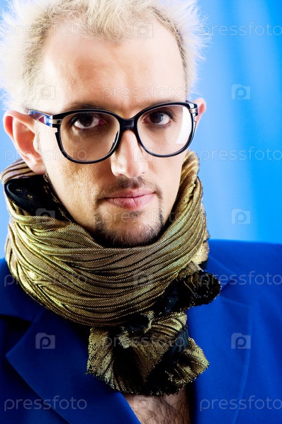 Импозантный мужчина в синем пиджаке с шарфом на голубом фоне