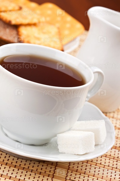 Чашка черного чая с сахаром и крекеры