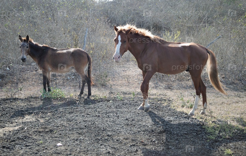 Дикая лошадь и осел на обочине дороги