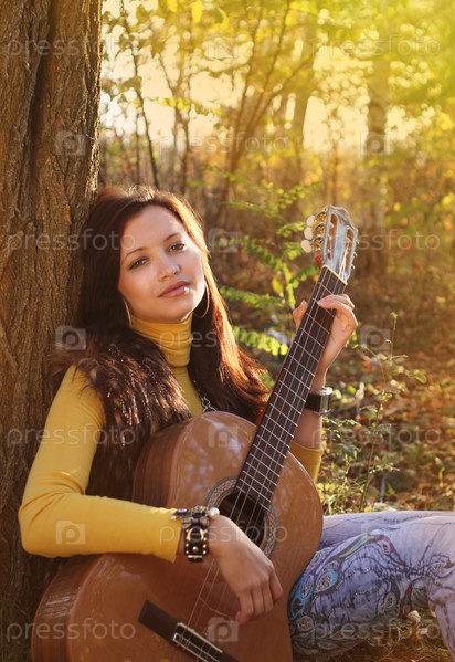 Девушка, играющая на гитаре в лесу
