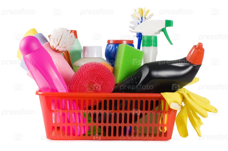 Корзина, полная чистящих средств и щеток