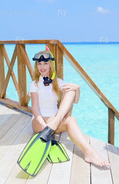 Красивая женщина в маске и ластах на фоне океана. Мальдивы