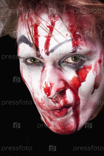 Злобный зеленоглазый мим с кровью на лице вблизи