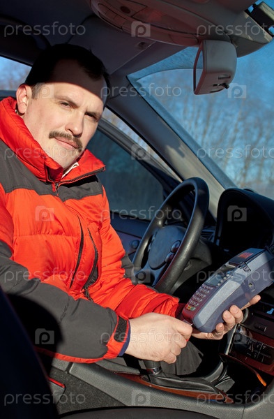 Карт-ридер для кредитной карты в руке таксиста в автомобиле