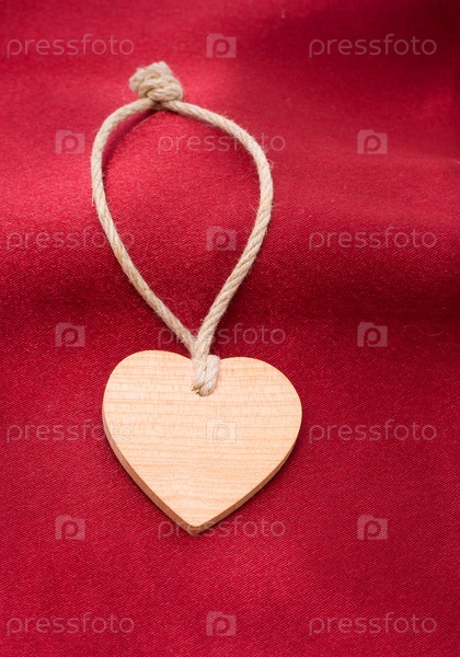 Деревянное сердце на красном атласном занавесе - Сувенир в день святого Валентина (Valentine's Day)