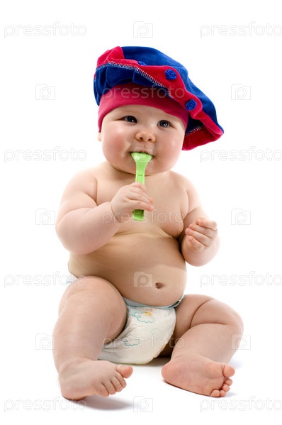 Улыбающийся ребенок сидит на белом фоне