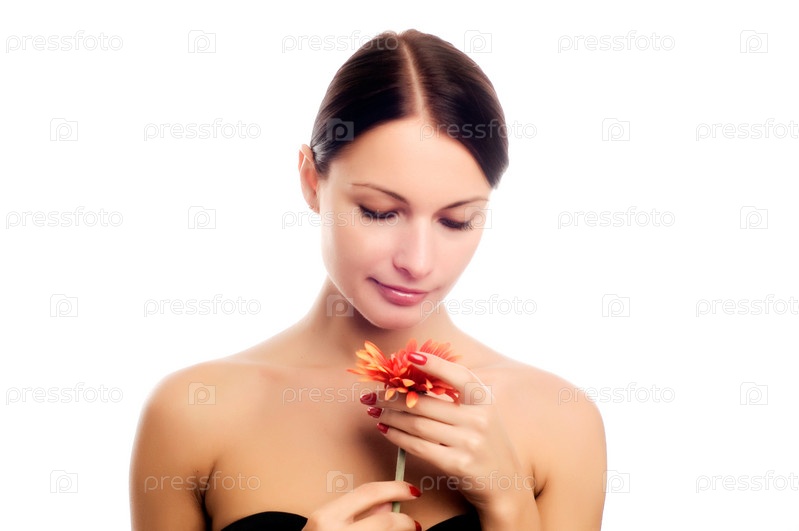Портрет свежей и красивой женщины с глазами цветка, изолированными на белом