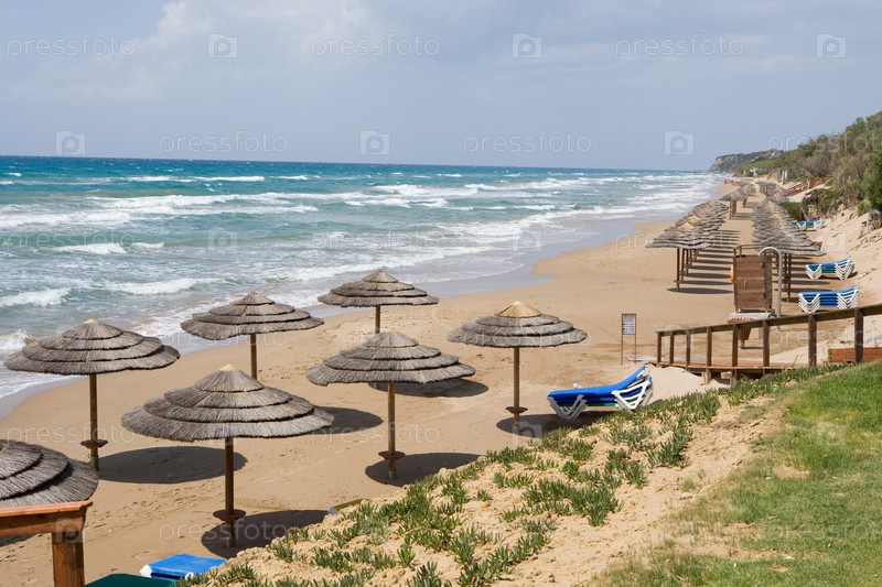 Пляжные зонтики на берегу полуострова Пелопоннес, Греция