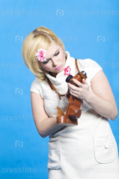 Блондинка снимает с ретро фотоаппарата в стиле пин-ап