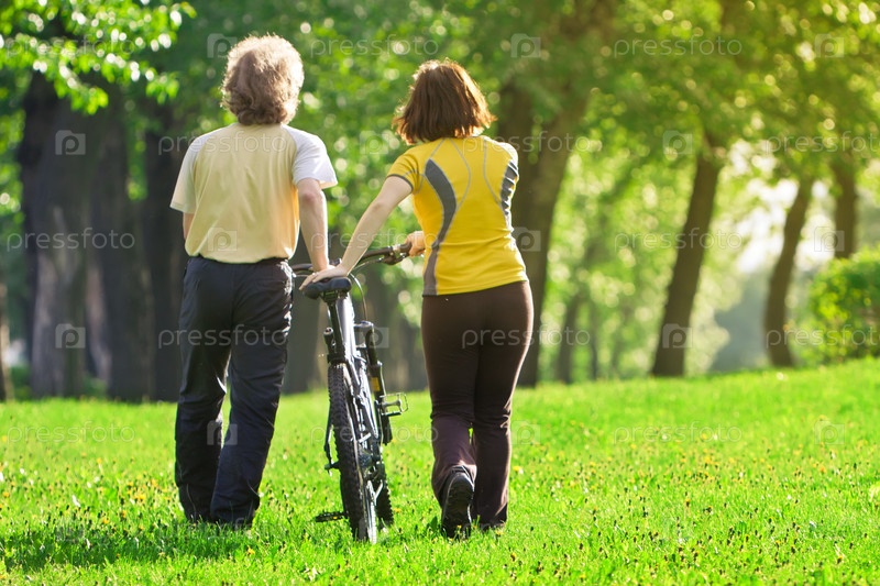 Мужчина и женщина с велосипедом идут по парку