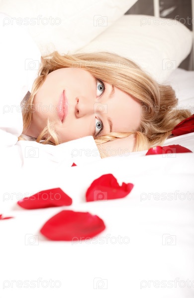 Девушка в постели с красными лепестками роз