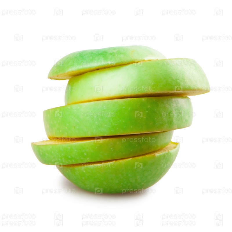 Разрезанное зеленое яблоко на белом фоне