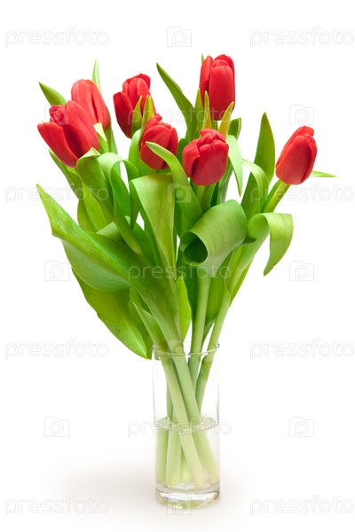 Букет красных тюльпанов в стакане на белом фоне