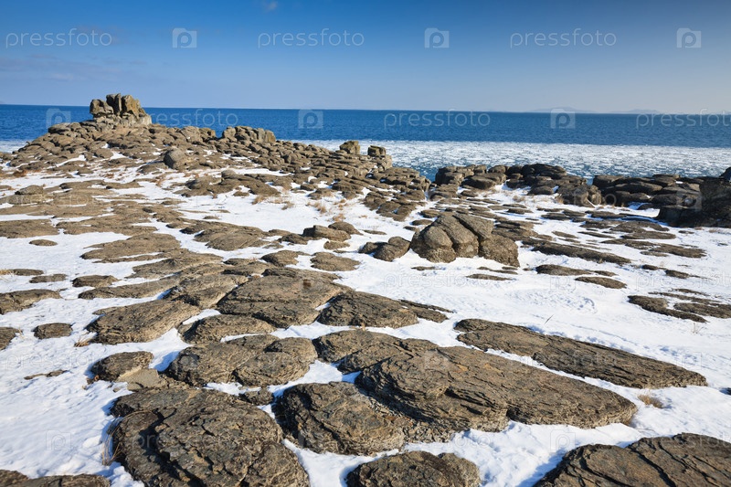 Дикий скалистый берег моря зимой