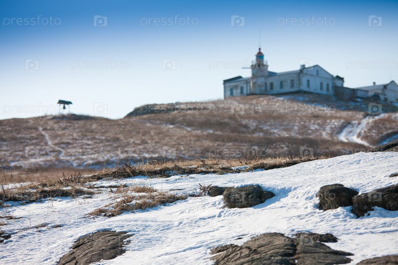 Старый колокол и здание маяка на берегу моря
