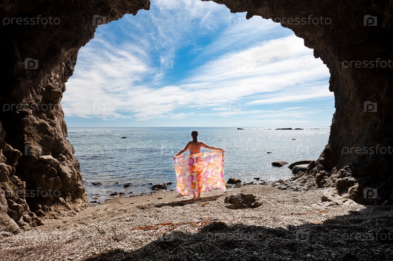 Девушка в купальнике с парео на фоне моря