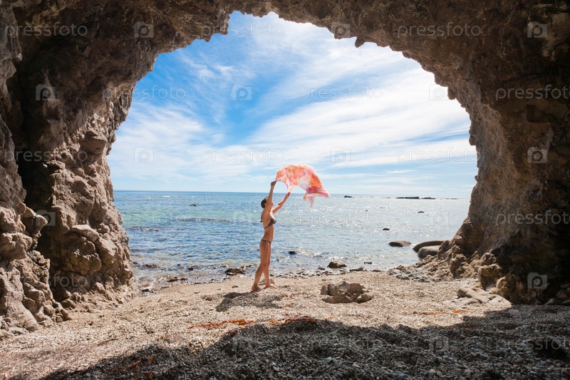 Девушка в купальнике с парео на фоне моря