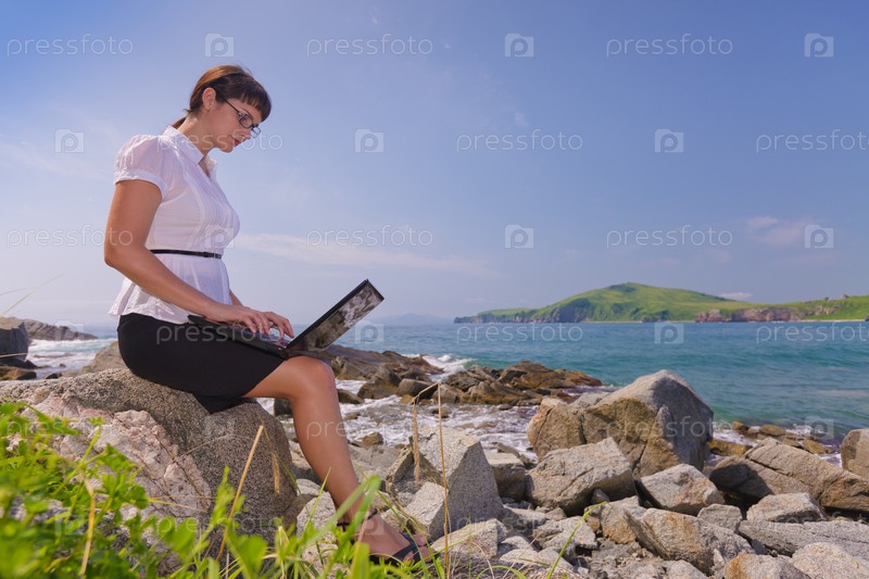 Красивая молодая брюнетка с ноутбуком на берегу моря