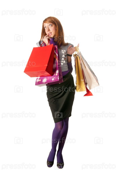Мечтательная гламурная девушка с цветными пакетами на белом фоне