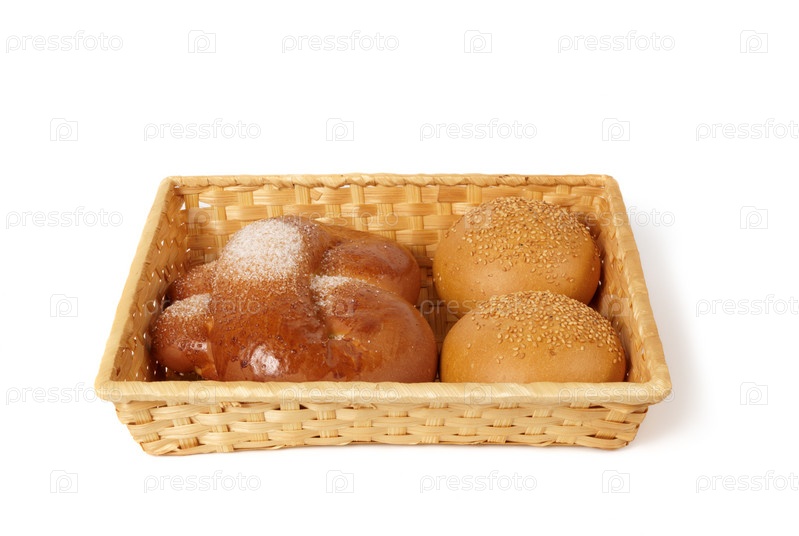 Плетеная корзина с булочками на белом фоне