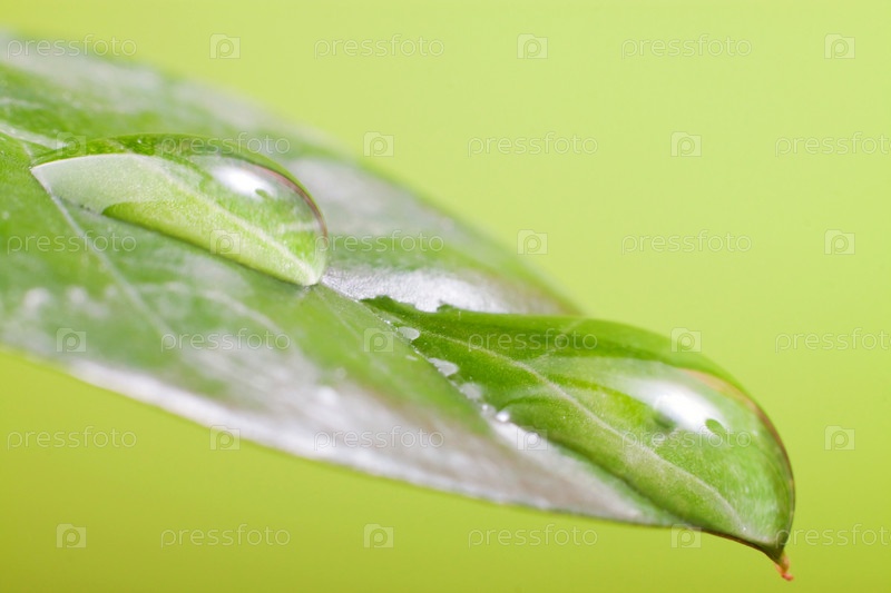 Капли воды на зеленом листе крупным планом