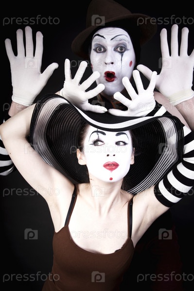 Портрет двух мимов в шляпах на черном фоне