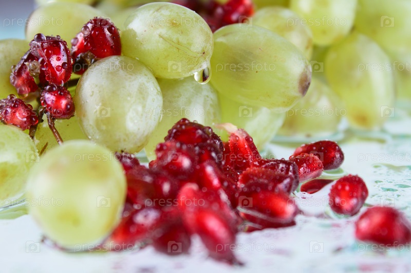 Виноград с гранатовыми зернами на стекле, удаленном вблизи