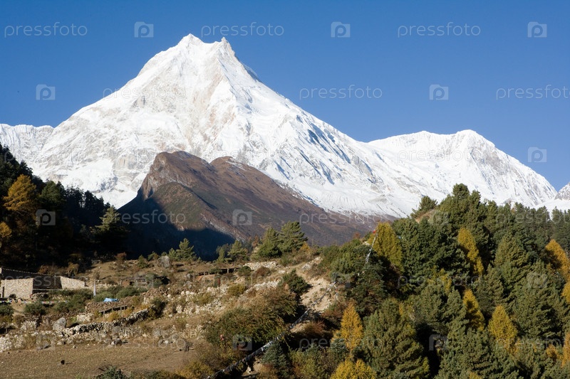 Непал. Вид на гору Манаслу (8163 м) из деревни Лхо (3180 м)