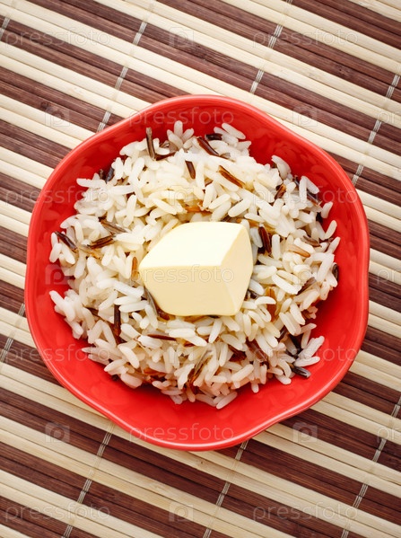 Красная чашка с вареным рисом и сливочным маслом на бамбуковой салфетке