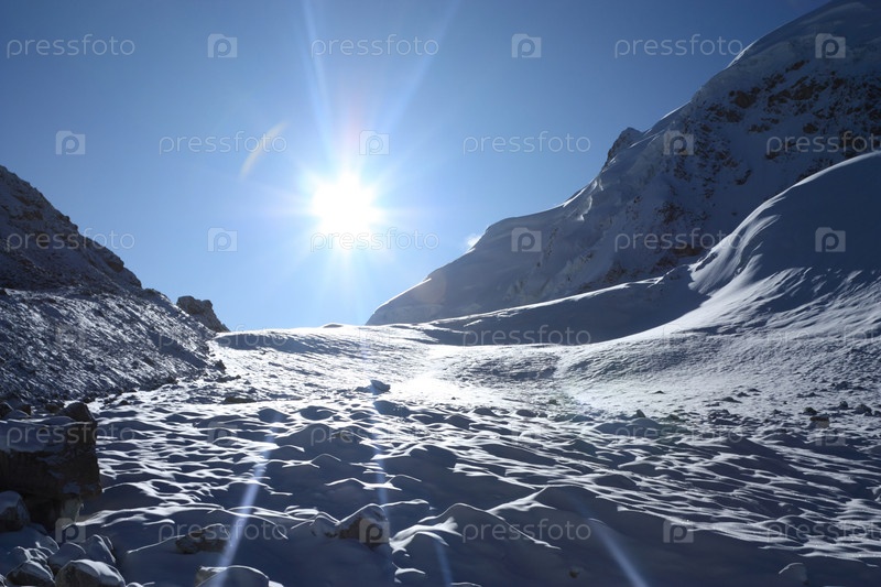 Яркие солнечные лучи проникают в вечный снег на высокогорье