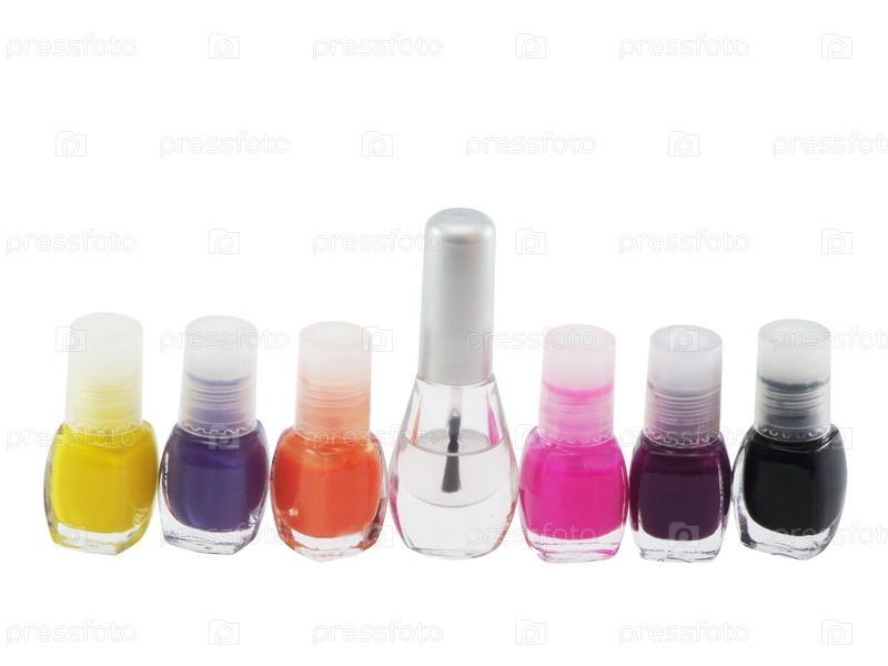 Флакончики с лаком различных цветов на белом фоне