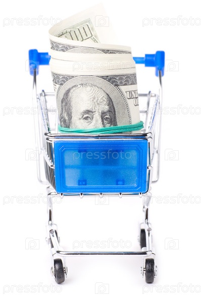 Иллюстрация долларовых купюр в продуктовой тележке