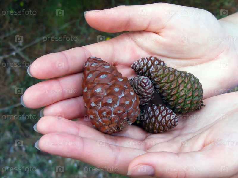 Конусы хвойных деревьев в руках крупный план в солнечный день