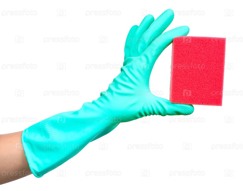 Рука в перчатке с красной губкой на белом фоне