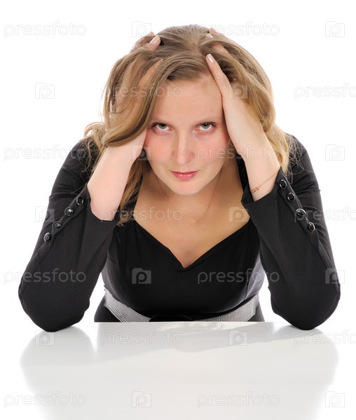 Портрет задумчивой женщины на белом фоне