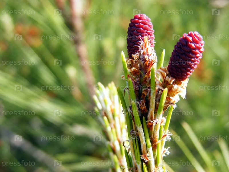 Небольшие сосновые шишки в конце ветви вертикально под солнечными лучами