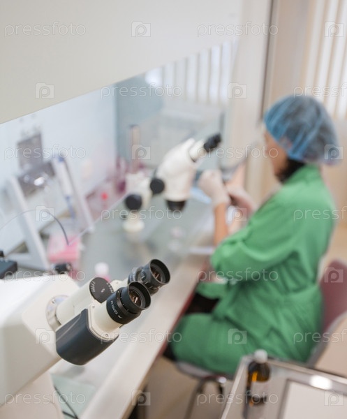 Женщина в зеленом медицинском халате проводит исследование в лаборатории