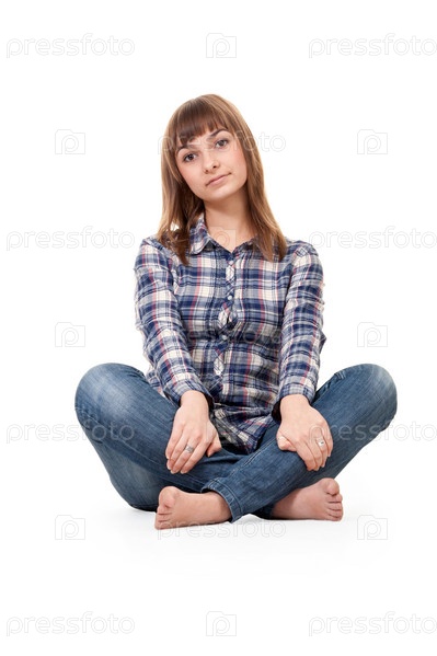 Девушка сидит в позе лотоса, белый фон