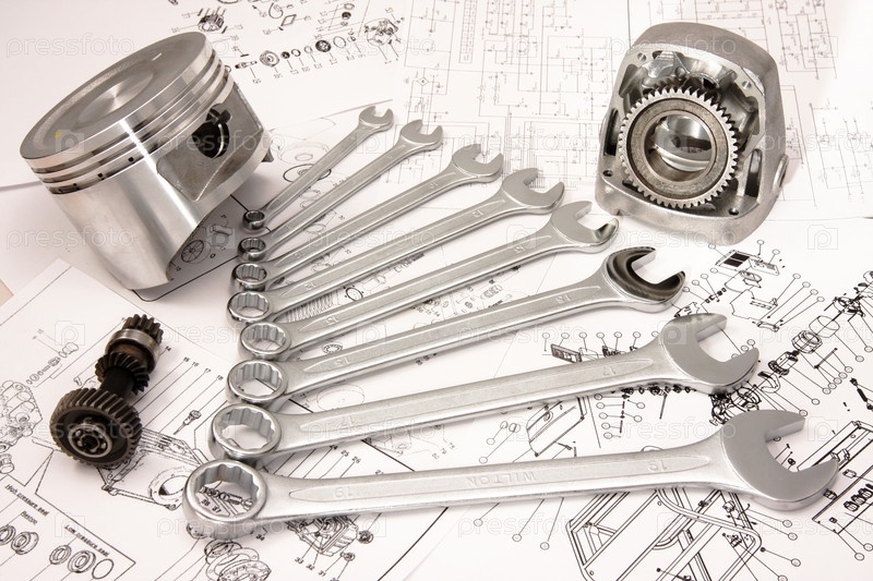 Поршень, набор гаечных ключей и другие детали