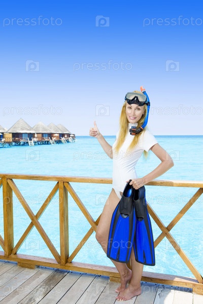 Молодая красивая женщина с ластами, маской и трубкой на берегу океана. Мальдивы