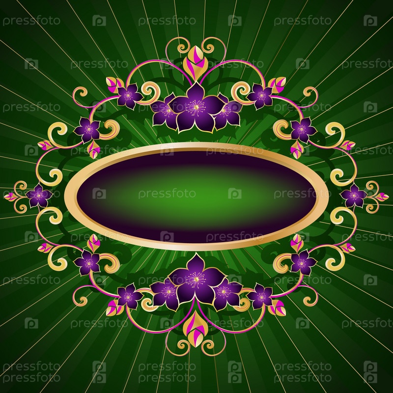 Абстрактное изображение овала окруженного цветами, на зеленом фоне