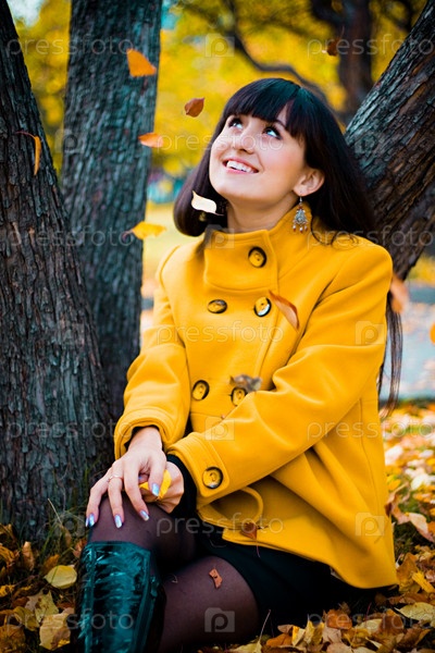 Девушка сидит возле дерева и смотрит на падающие листья