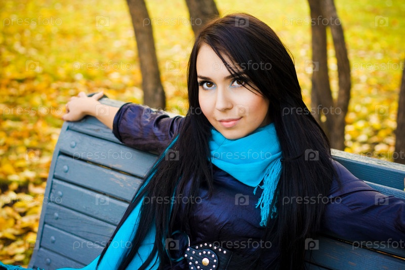 Молодая девушка сидит на скамейке