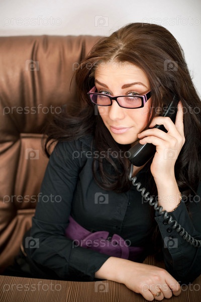 Девушка сидит за рабочим столом и звонит по телефону