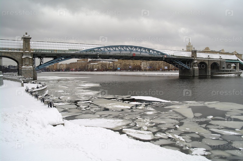 Пушкинский мост через реку зимой в Москве